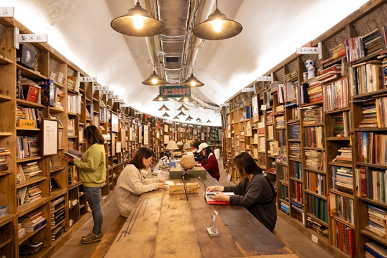 2023年11月9日,重庆,由防空洞改造的“军哥书屋”内,人们在看书。