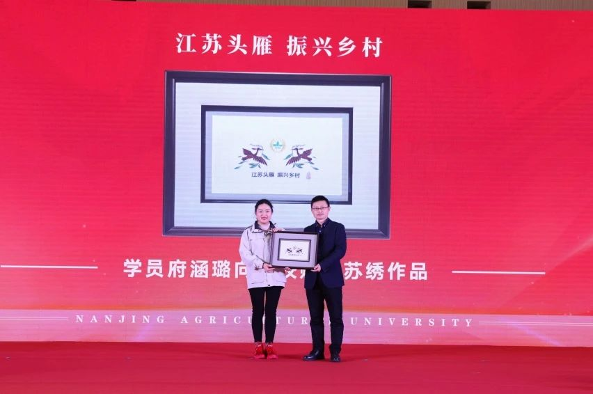 现场,来自镇江丹阳新星土元专业合作社的刘水新作为江苏优秀“头雁”学员代表发言。“头雁”学员府涵璐向学校赠送“江苏头雁、振兴乡村”苏绣作品。