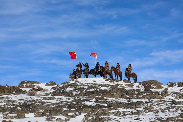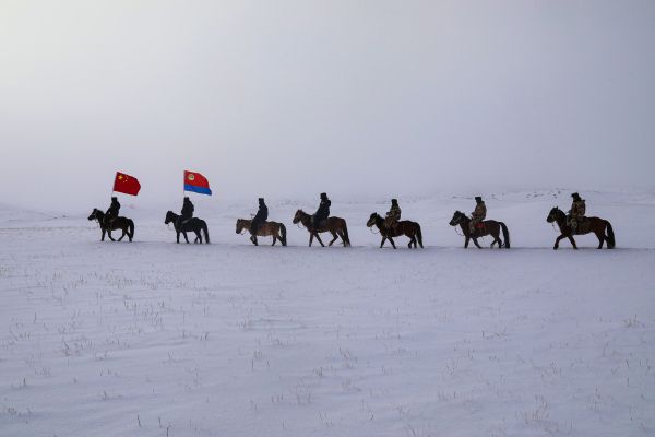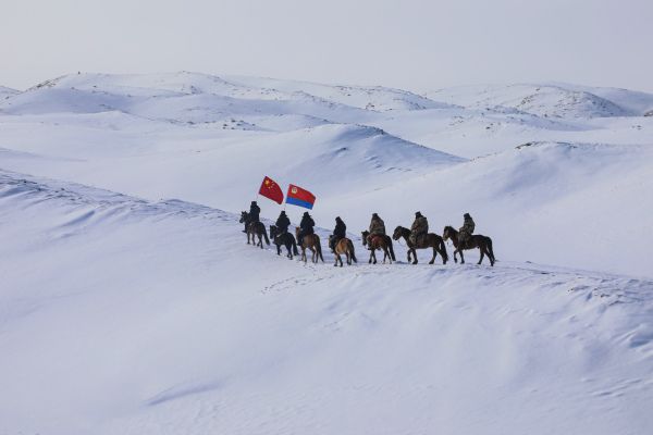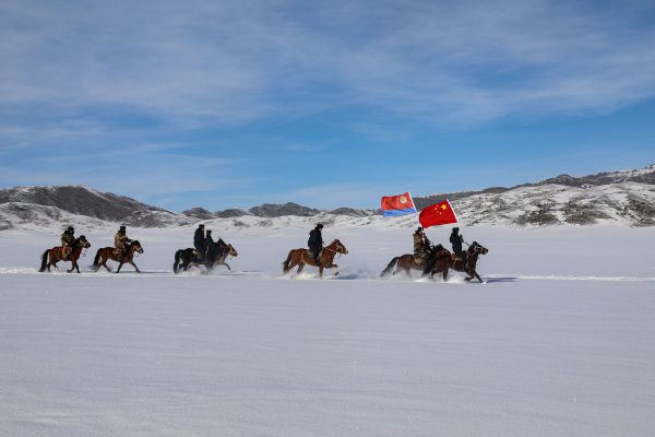 2024年1月8日,在第四个“中国人民警察节”到来之际,新疆出入境边防检查总站阿勒泰边境管理支队查干郭勒边境派出所移民管理警察与护边员组建“马背巡逻队”,翻山越岭深入边境前沿开展巡边踏查。