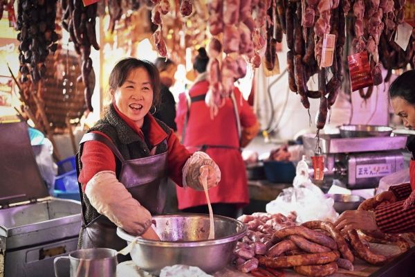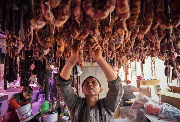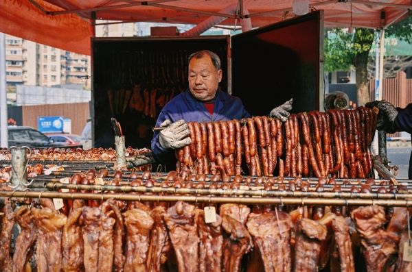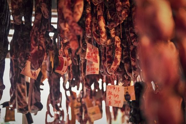 2024年1月9日,重庆,春节将至,不少市民已经开始准备熏制香肠腊肉。南岸区铜元局街道无烟环保熏制点,工作人员正在熏制腊肉。据了解,无烟熏制点均使用传统熏制原材料——松柏枝、木炭、锯木面、橘皮等,既能保证腊制品的传统美味,又能消除违规熏制腊制品造成的大气污染和安全隐患。每天可以熏制3000余斤腊制品,市民早上送来的腊制品下午就能取走,非常方便和高效。既满足了市民需求,又践行了环保要求,深受广大市民欢迎。