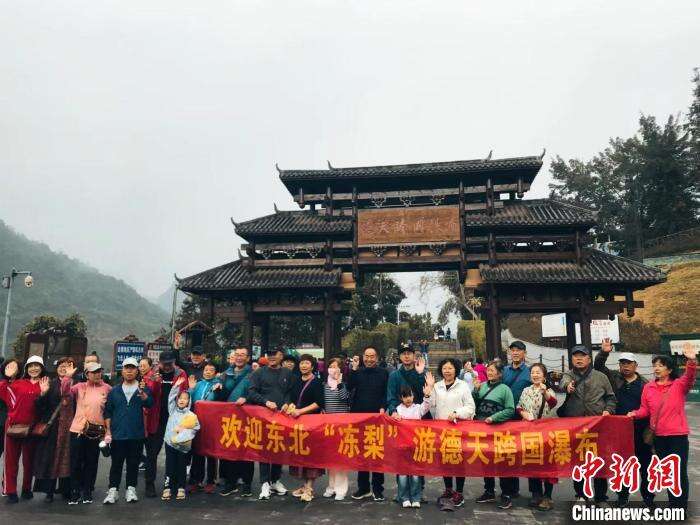 在位于广西崇左市大新县的德天跨国瀑布景区,来自黑龙江、吉林、辽宁等地的东北游客畅游中越边关“山水画廊”,领略中越两国美景及人文风情。为了打造更暖心的体验,景区特别制作了大型欢迎横幅,还提供免费的咖啡和砂糖橘,让游客宾至如归。