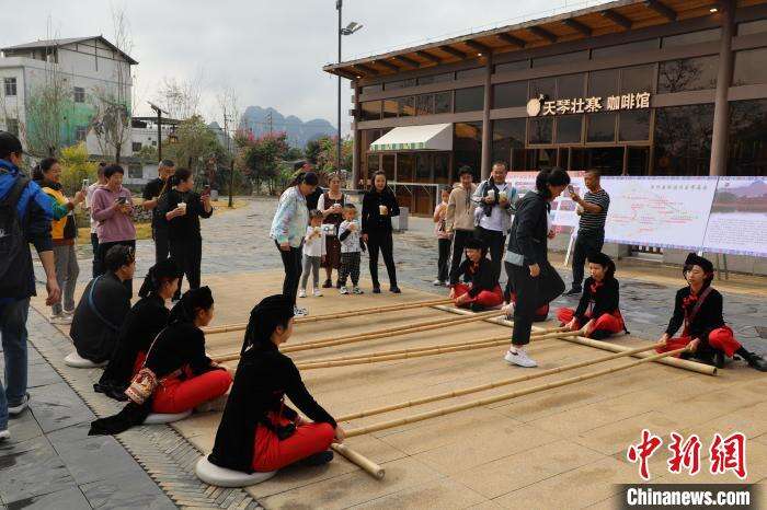 在崇左市龙州天琴壮寨景区,壮族姑娘热情地邀请东北“老铁”品尝甘蔗汁和砂糖橘,活动现场还开展天琴弹唱表演以及竹竿舞、舂糍粑、古法红糖制作技艺体验、金龙壮锦制作体验等民俗活动,现场其乐融融。