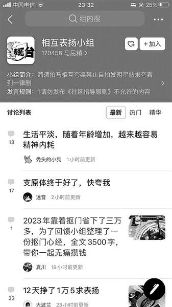 截至目前,该小组共有17万成员,组员的昵称为“马屁精”,小组的规则简明扼要——“溜须拍马、相互夸奖”。