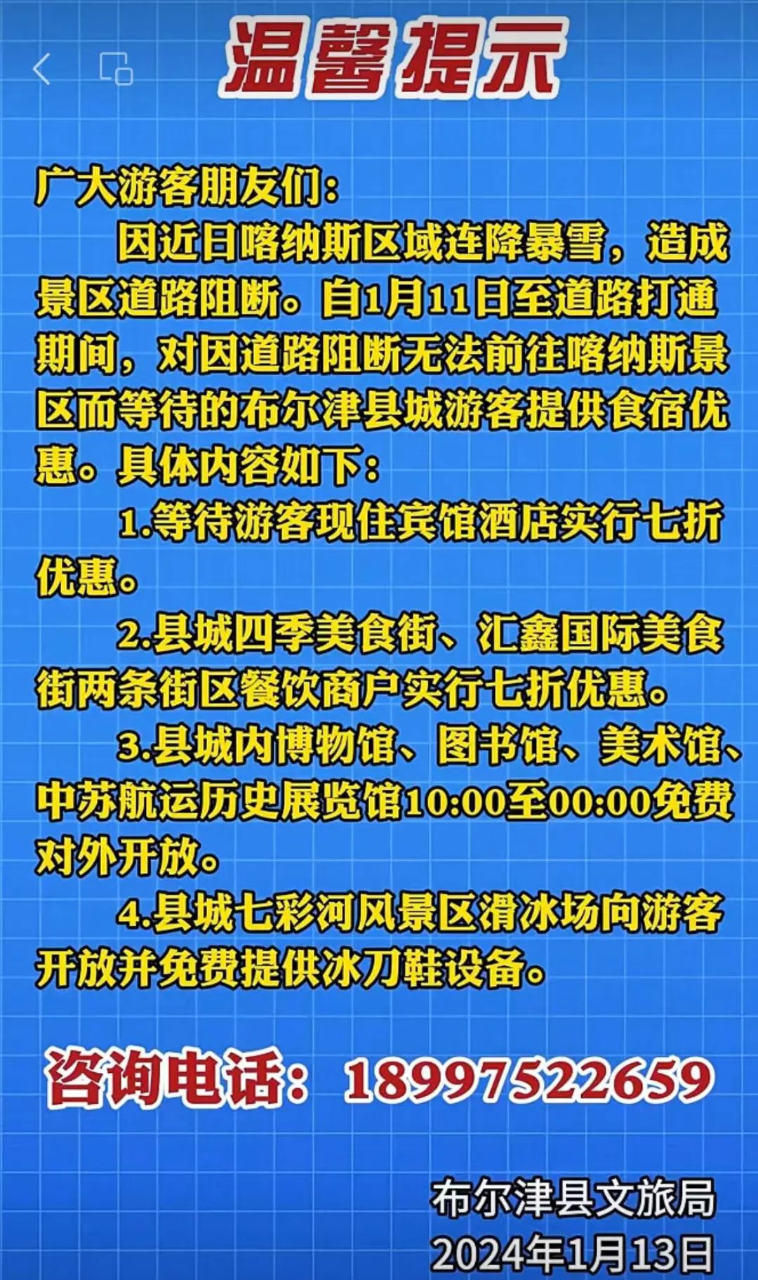1月13日,喀纳斯景区管委会发布公告称,对景区内滞留的游客实行食宿免费。具体内容包括:喀纳斯村、禾木村、白哈巴村滞留旅客现居住酒店住宿费用全免;喀纳斯村、禾木村、白哈巴村免费提供餐饮。