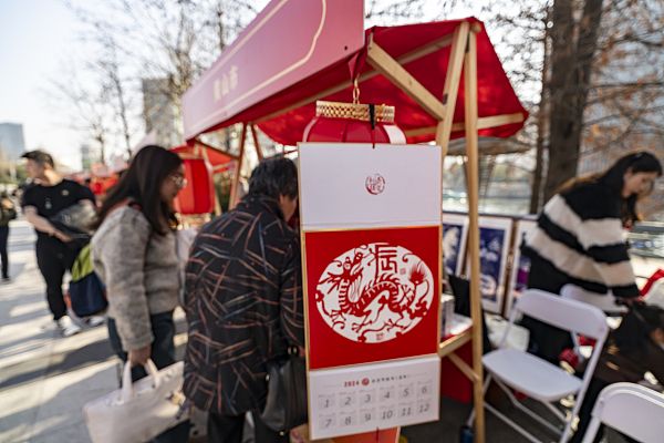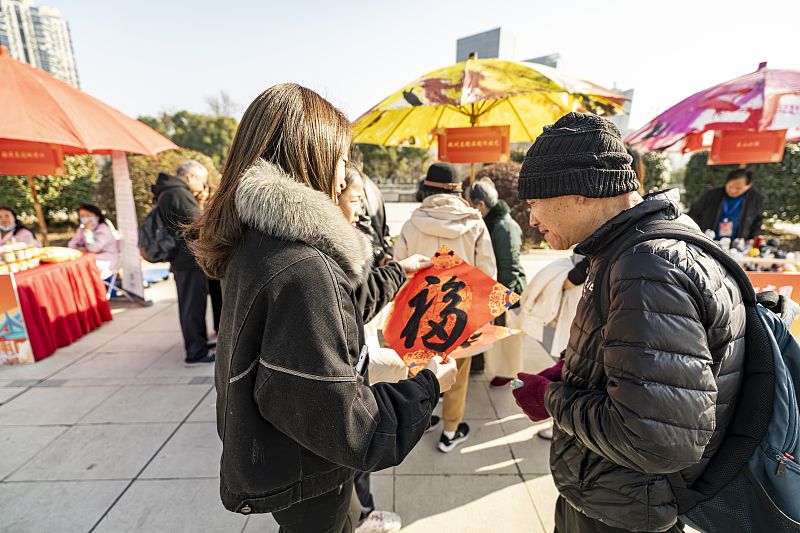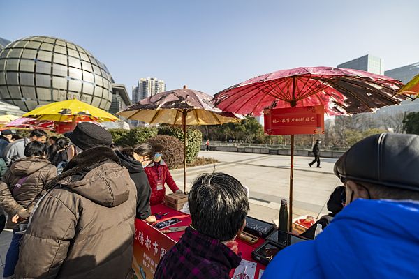 2024年1月13日,杭州,“非遗大花伞市集”在西湖文化广场举办,一把把绚丽的花伞为本次活动增添了一抹与众不同的色彩,多位非遗传承人现场向市民和游客展示木版水印技艺、等丰富多彩的非遗项目。