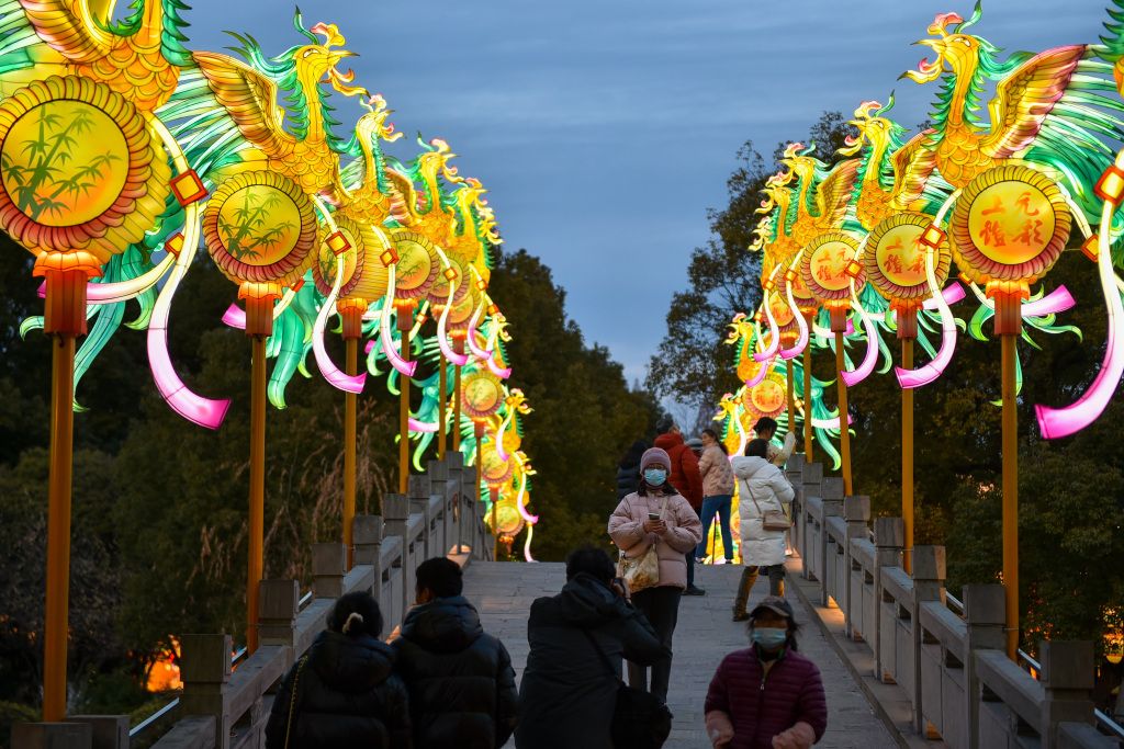 2024年1月15日,南京,游客在白鹭洲公园观赏花灯。