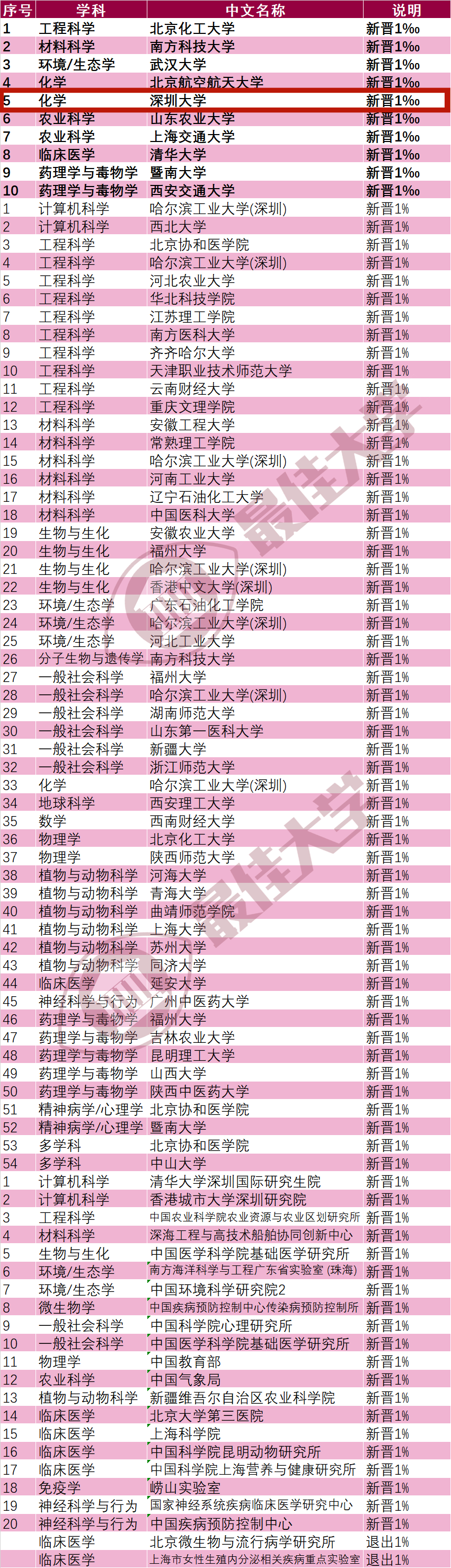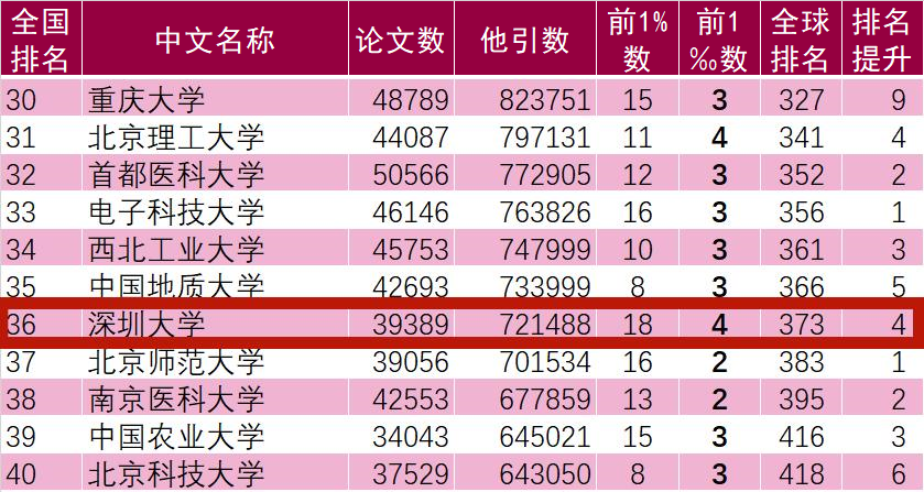 全国(除港澳台地区)有学科进入全球前1%的442所高校中(北京协和医学院计入高校,北京协和医院计入机构,分开计算),深圳大学位居36名。
