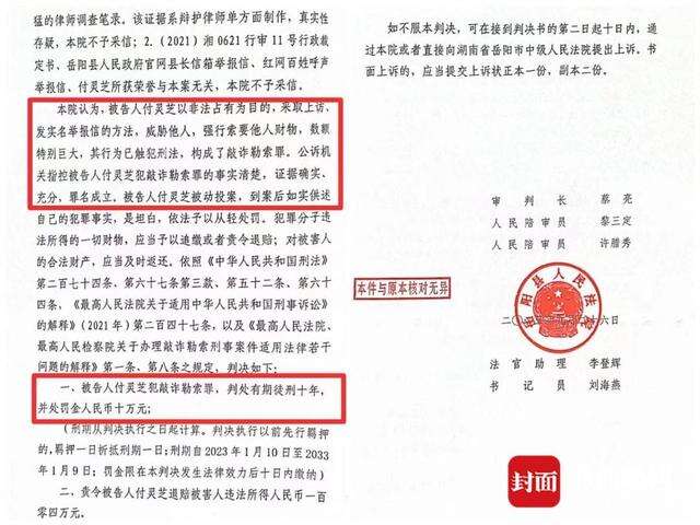 判决书显示,2023年9月26日,湖南省岳阳县法院一审以敲诈勒索罪,判处付灵芝有期徒刑10年。一审法院认为,付灵芝通过信访、网络举报的方式,给畅佳公司施加压力,迫使该公司与其协商迁坟事宜,并达成其补偿要求。