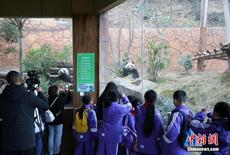 重庆新添的大熊猫“青花”“青露”亮相,吸引参观者驻足参观。王成杰 摄