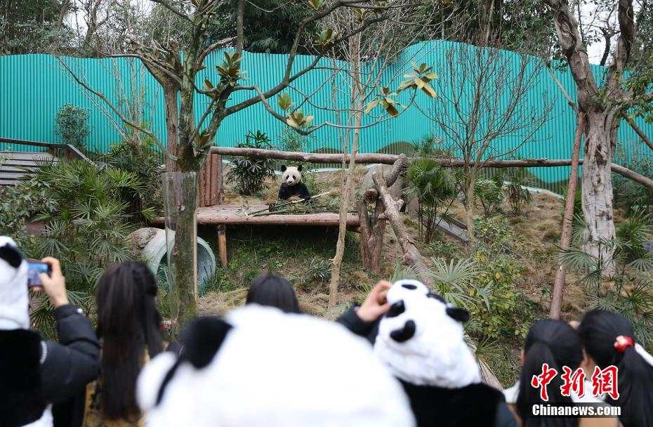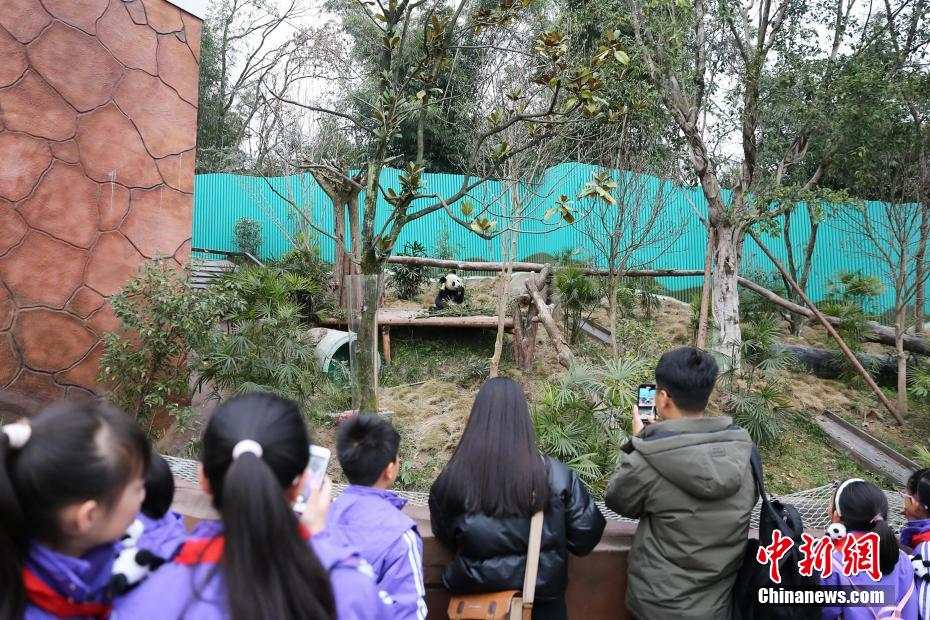 1月18日,重庆永川乐和乐都动物主题乐园的四只大熊猫“青花”“青露”“巧月”“爱莲”正式与游客见面。据悉,四只大熊猫来自中国大熊猫保护研究中心,经过隔离适应期后,于当日正式与游客见面。图为重庆新添的大熊猫“爱莲”吸引参观者眼球。王成杰 摄(中国新闻网)