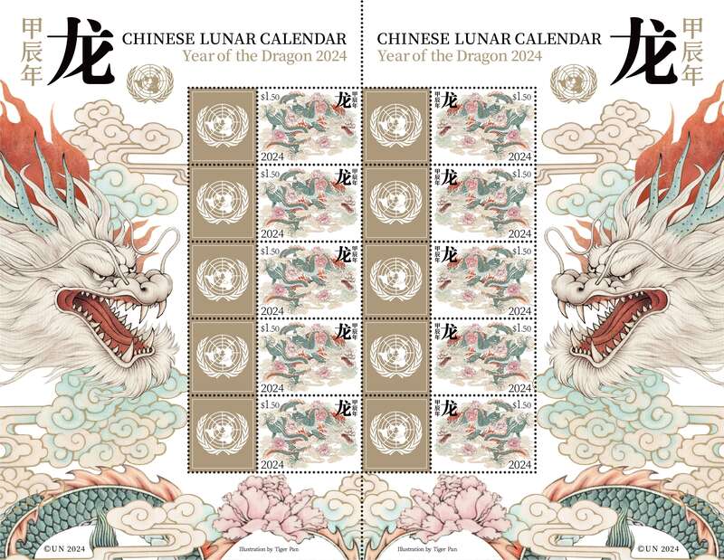 联合国邮政管理局2010年5月首次发行以中国生肖为内容的邮票,到2021年已发行了首轮12张生肖邮票。2024年的龙年邮票是第二轮生肖邮票的第三张。(央视记者 徐德智)