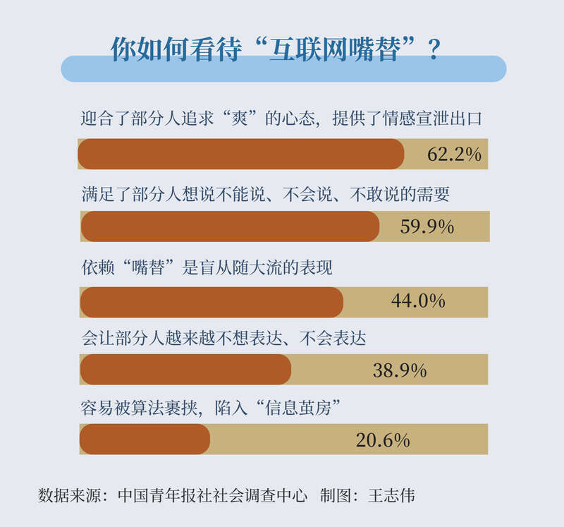 “怎样高情商回复领导”“你说出了我一直不敢说的”“会说就多说点”……如今在互联网上,发言犀利、风格鲜明的“互联网嘴替”受到不少网友的追捧。上周,中国青年报社社会调查中心联合问卷网(wenjuan.com),对1333名青年进行的一项调查显示,62.2%的受访青年认为“互联网嘴替”迎合了部分人追求“爽”的心态,提供了情感宣泄出口,59.9%的受访青年认为满足了部分人想说不能说、不会说、不敢说的需要。