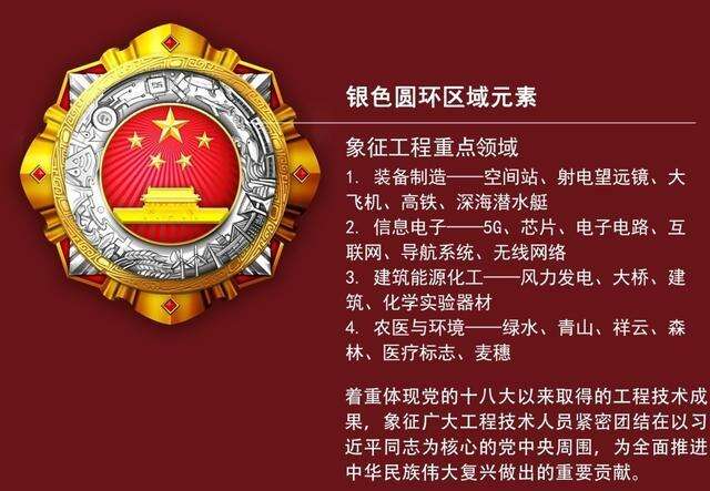 奖章中的工程技术元素选取的是我国具有代表性的工程技术成果,如高速铁路、5G、港珠澳大桥、杂交水稻等,象征我国科技创新事业发生的历史性、整体性、格局性重大变化。