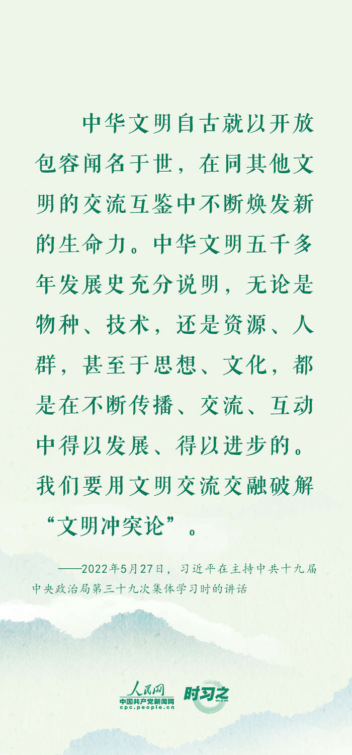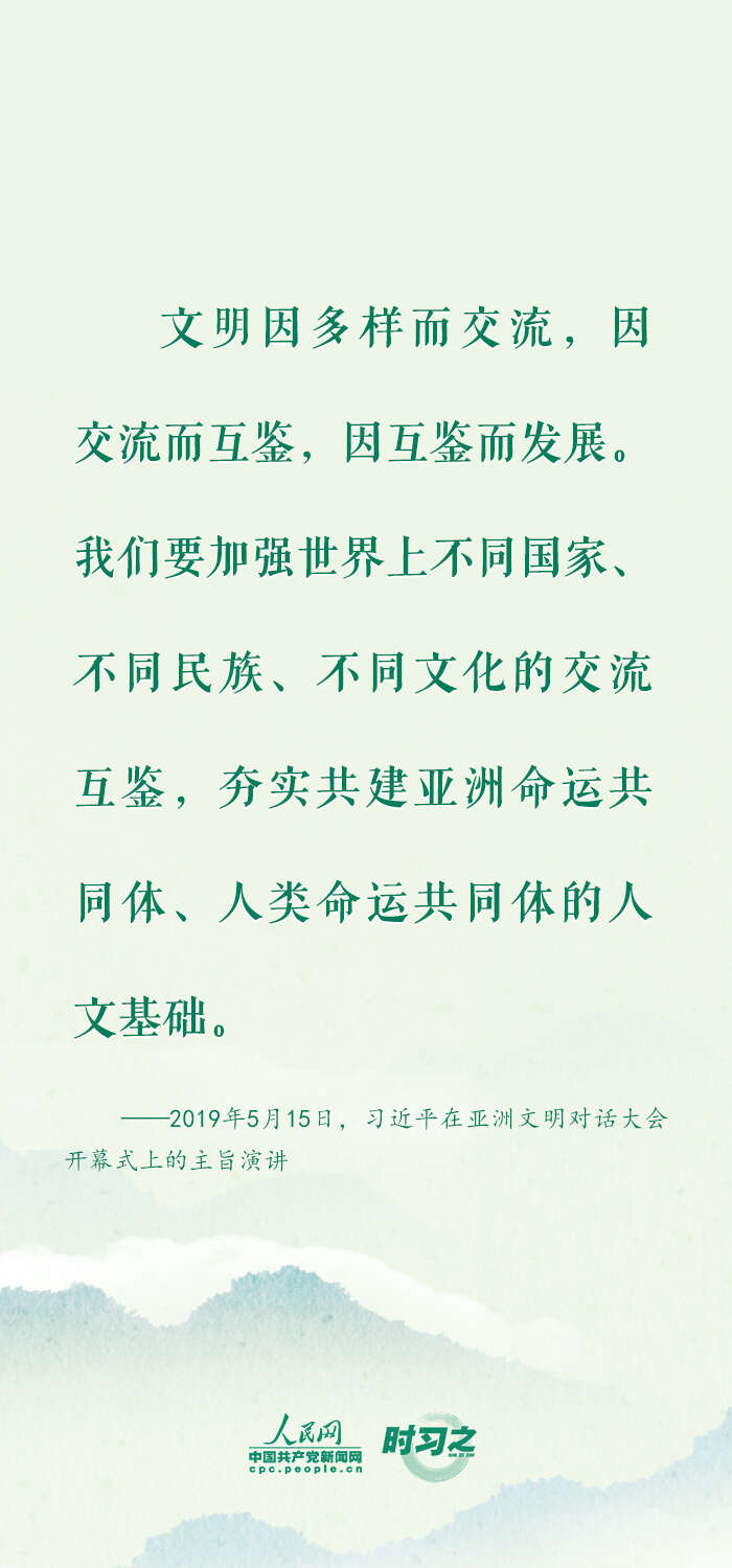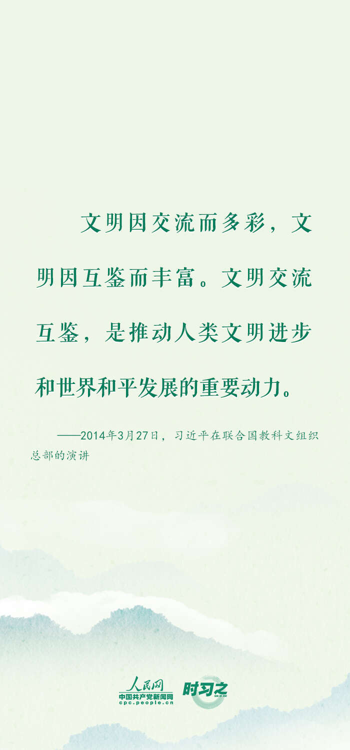 文化因交流而多彩,文明因互鉴而丰富。习近平在不同场合多次发表重要讲话,推动不同国家、不同民族、不同文化间加强交流互鉴,共同绘就美美与共的人类文明画卷。
