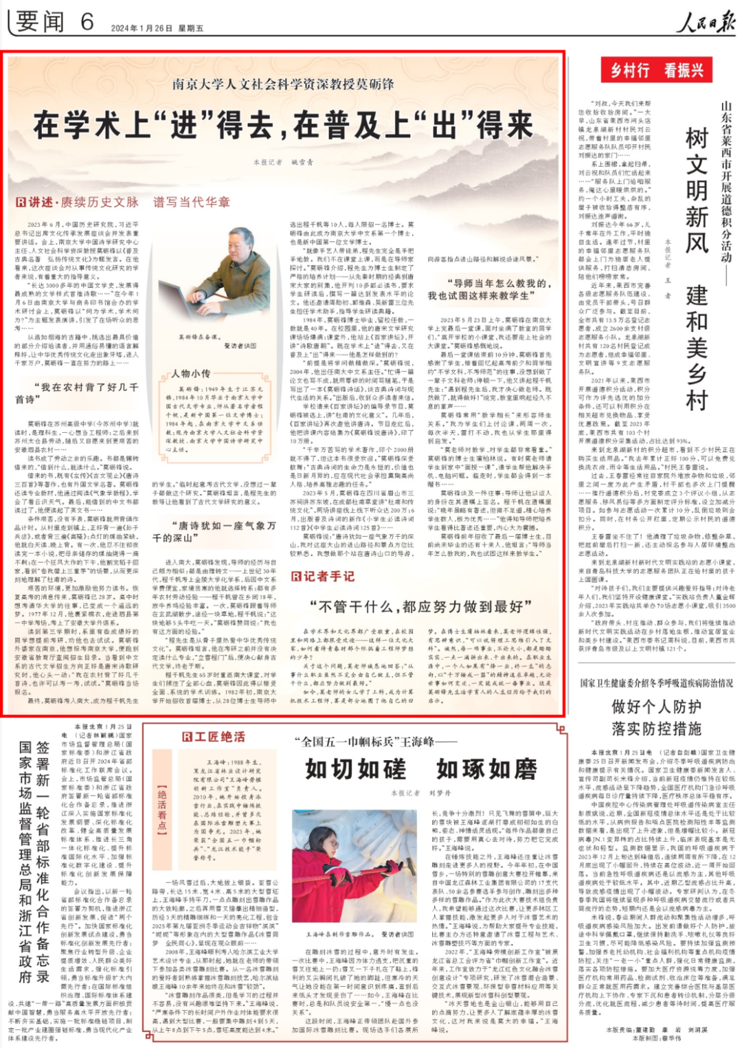 1月26日,《人民日报》刊登题为 《 在学术上“进”得去,在普及上“出”得来》的文章,大篇幅报道了南京大学人文社会科学资深教授莫砺锋潜心治学、精心育人、尽心传播弘扬中华优秀传统文化的事迹。全文内容如下: