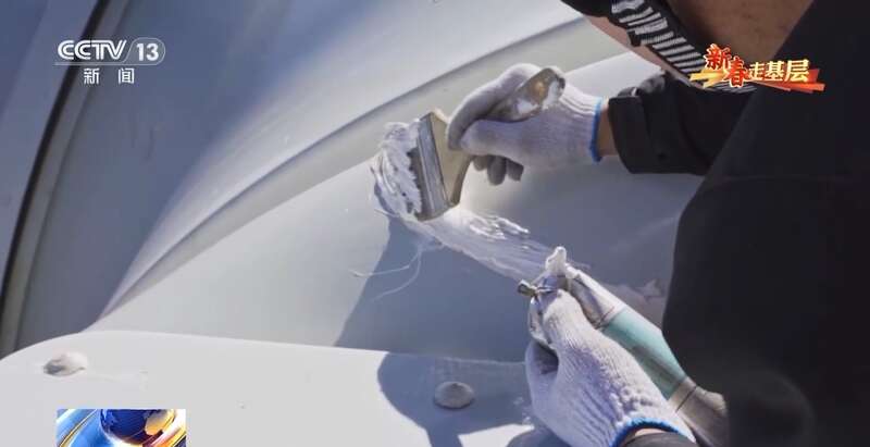 像这样的突发情况,在高原上在所难免,温差大、紫外线强,风机更容易出问题。事不宜迟,尹舒展和同事赶紧趴在机舱上,一点点填补密封胶。看上去只是简单的补胶,但在这样的环境里,不仅需要勇气和胆量,更要顶住严寒缺氧给身体带来的不适。