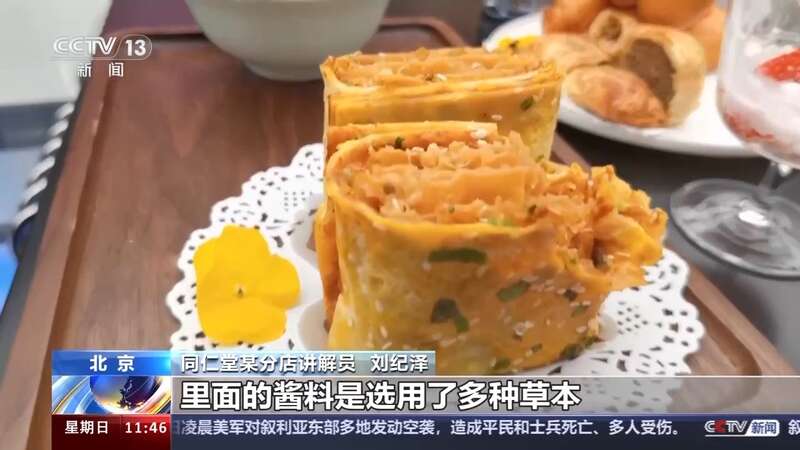 同仁堂某分店讲解员 刘纪泽:刚刚您尝到的这款千层酥煎饼,里面的酱料是选用了多种草本,我们现在在健康基础之上,又融合了美味的成分在里面。