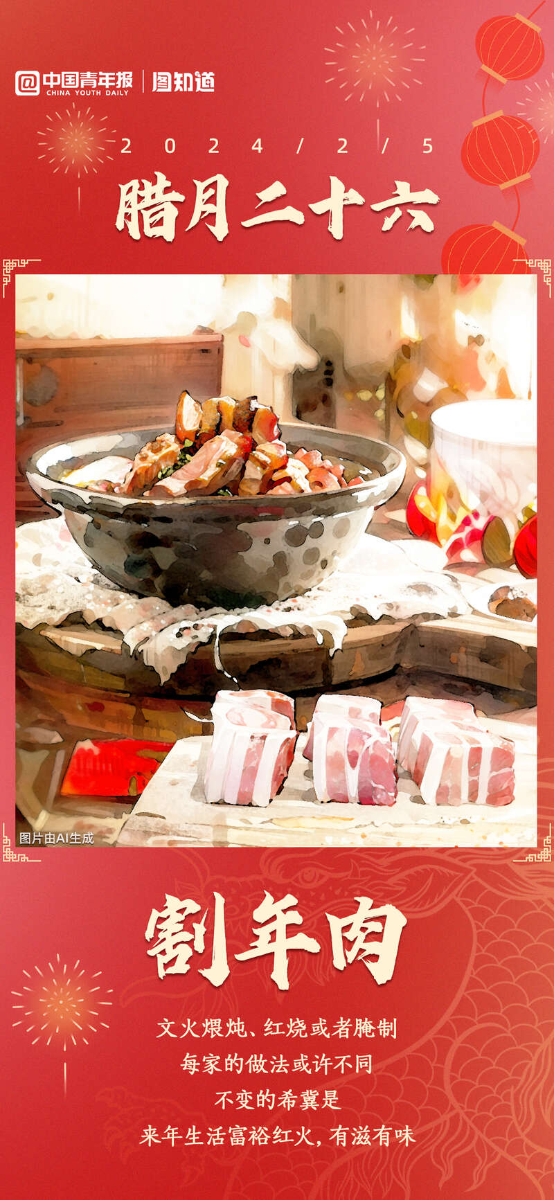 腊月二十六这天,家家户户都要筹备过年的肉食。在过去生活水平不高的时期,人们到了年节才会去购买上好的食材,下功夫烹制,美餐一顿肉食。文火煨炖、红烧或腌制,每家的做法或许不同,不变的希冀是来年生活富裕红火,有滋有味。当然,饭桌上这道朴实的菜品,最美味的一刻应是阖家团圆时。