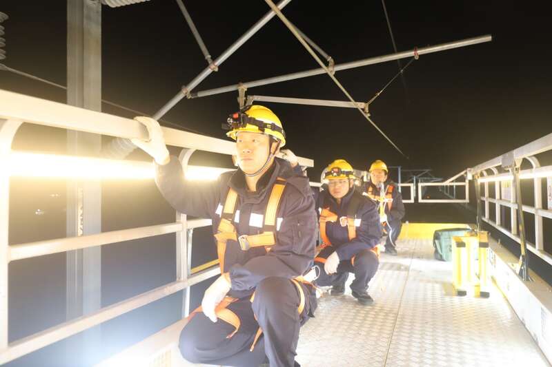 不一会儿,检修列车准时到达作业位置,在做好人员安全防护后,作业负责人戴军通知开始作业,号长常海安带领着青工们迅速扎好安全带,按照职责分工对各自负责的A、B、C三区进行检查,重点查看定位器入槽、有无裂纹情况;查看吊弦有无断股、散股、鼓包情况;查看电气连接部件有无松动、锈蚀等情况……寒夜中,他们认真地检查着每一处接触网设备,不敢有丝毫懈怠。