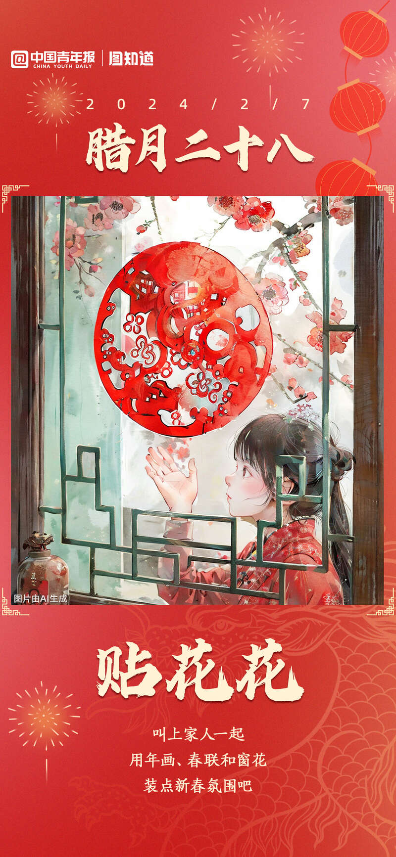年谣云:“腊月二十八,打糕蒸馍贴花花”。家家户户在这天不但要准备过年的主食,还要张贴年画、春联和窗花。我国有记载以来的第一幅“春联”,是五代时后蜀君主孟昶写于桃符上的“新年纳余庆,嘉节号长春”。如今,红纸上各种吉祥寓意的春联、大大小小的“福”字,走入千家万户,装点新春的喜庆氛围。今天,你“贴花花”了吗?