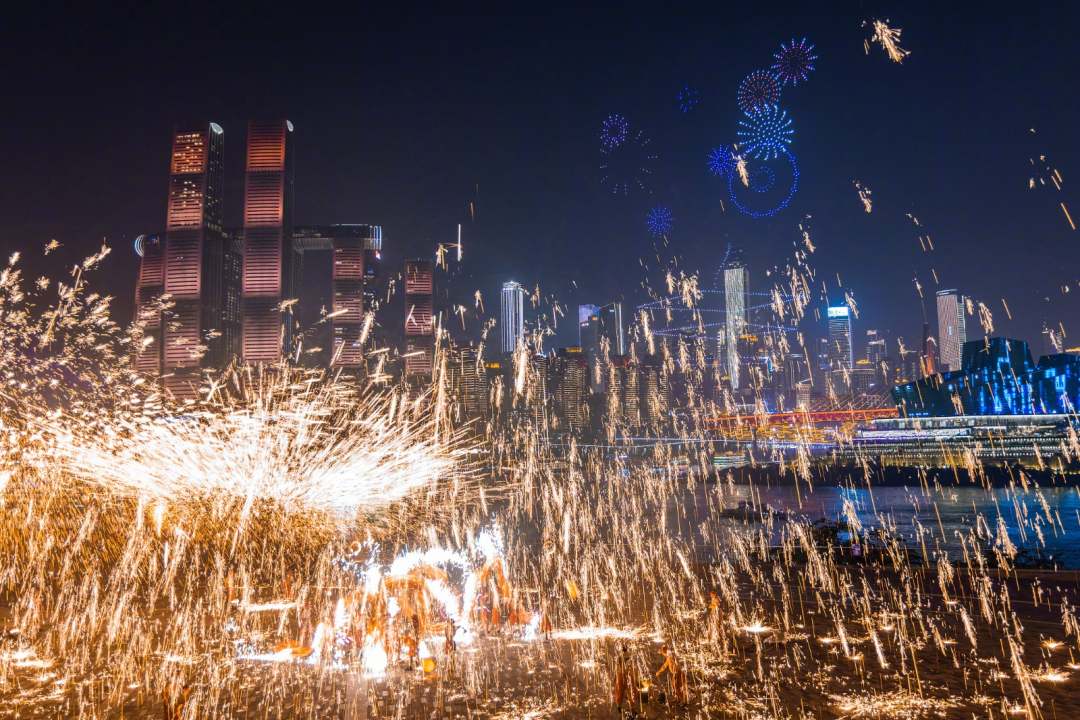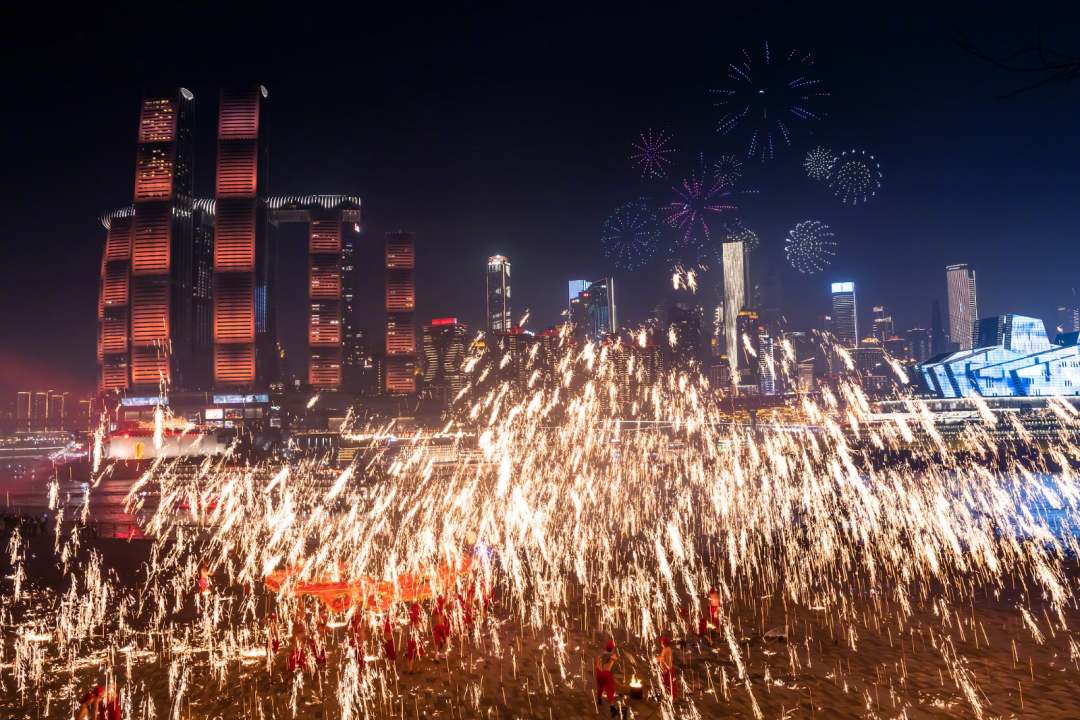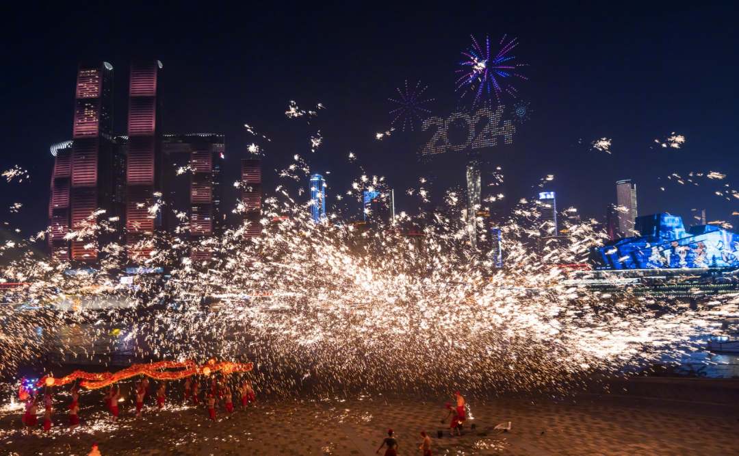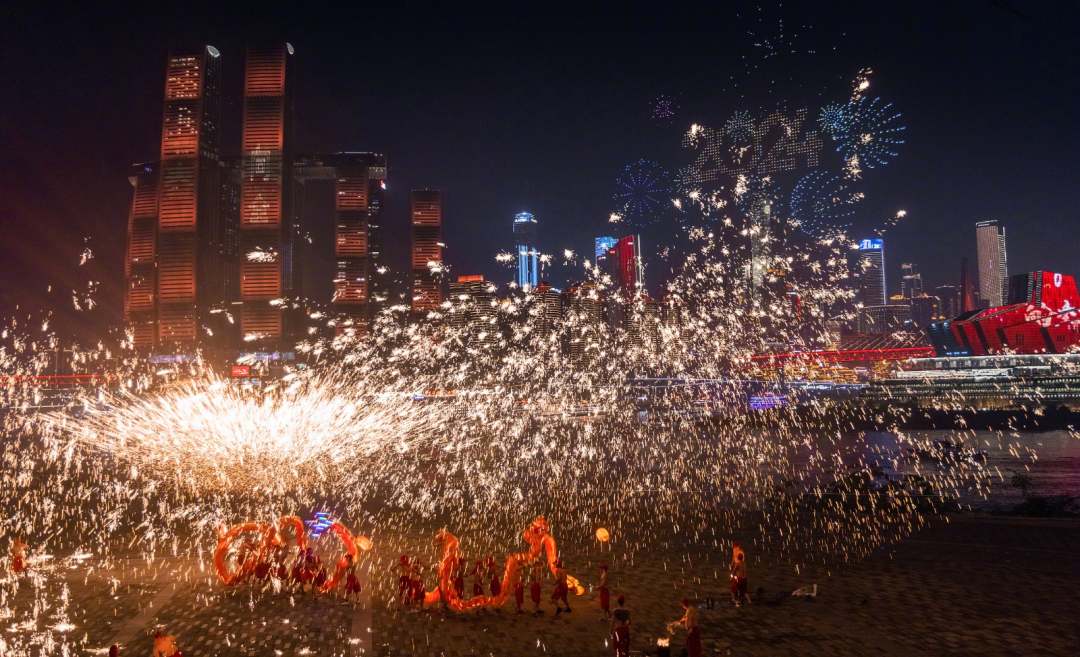 2024年2月9日,重庆,除夕夜,南滨路进行舞龙打铁花表演,流光溢彩,绚烂耀眼。