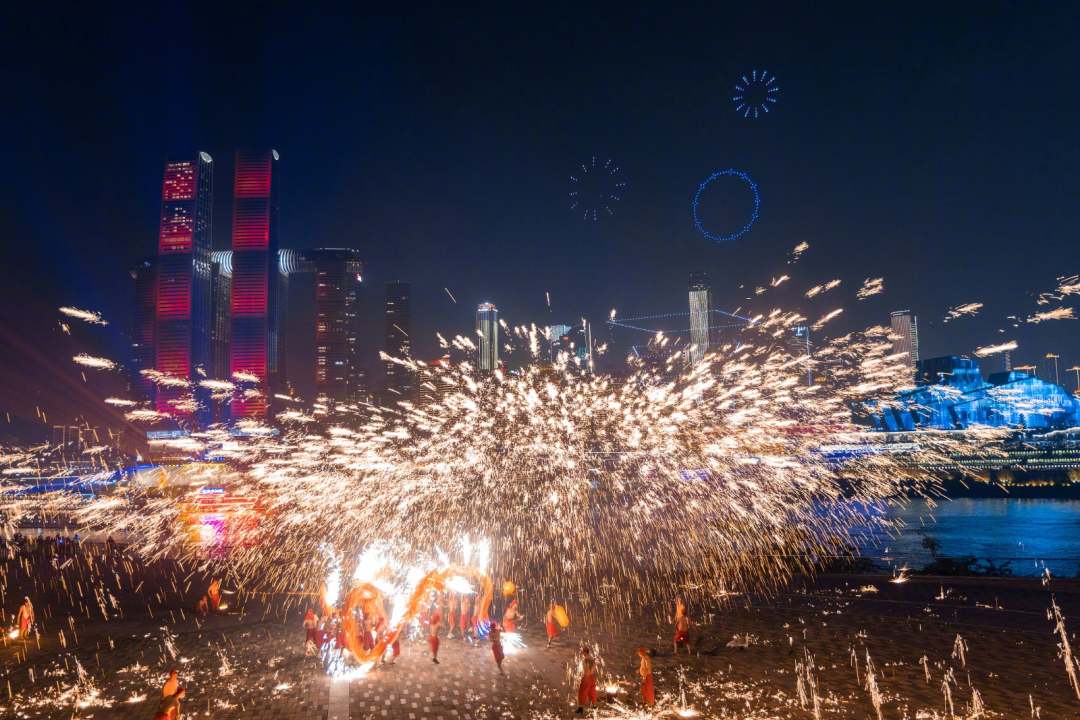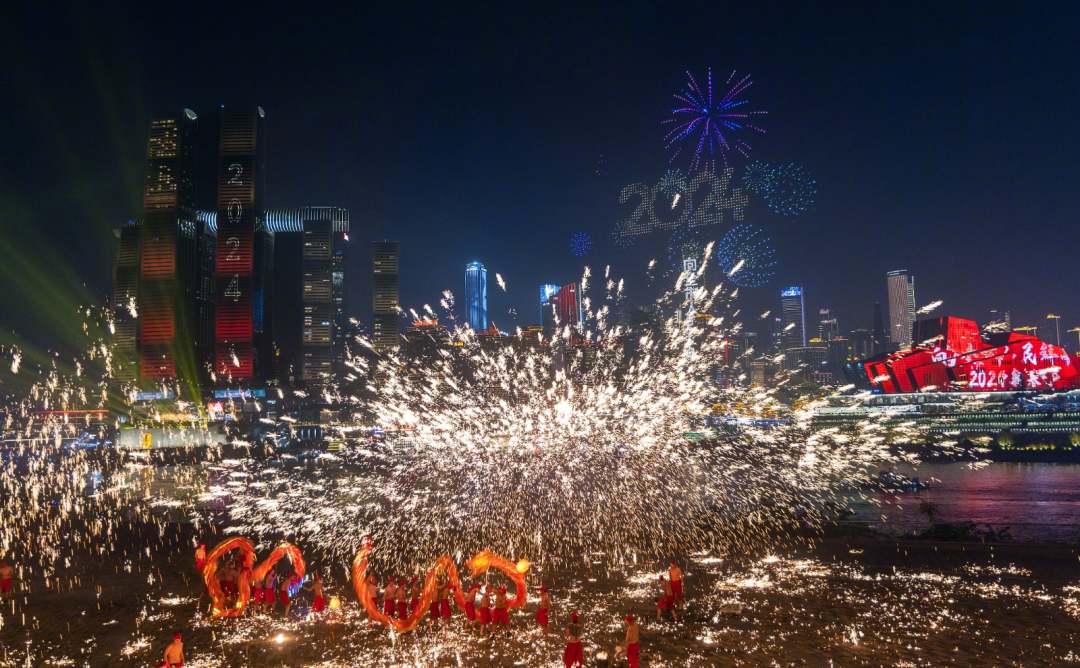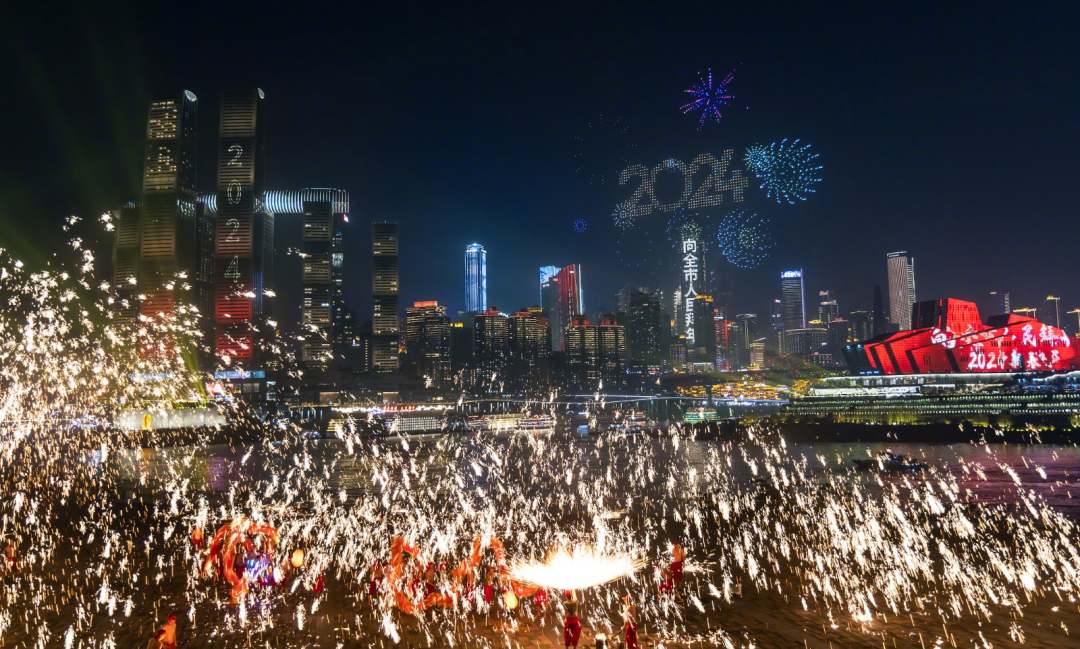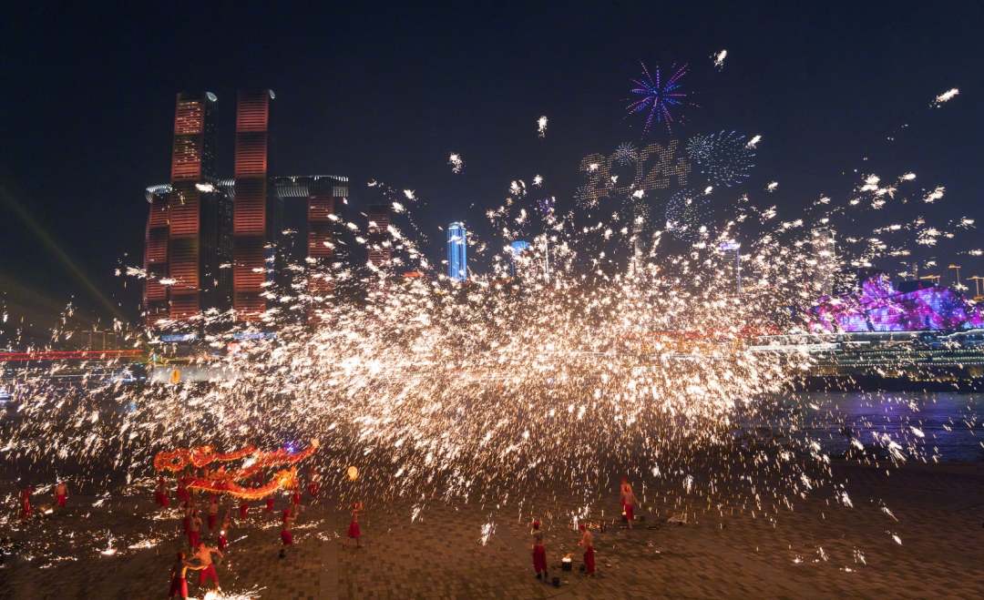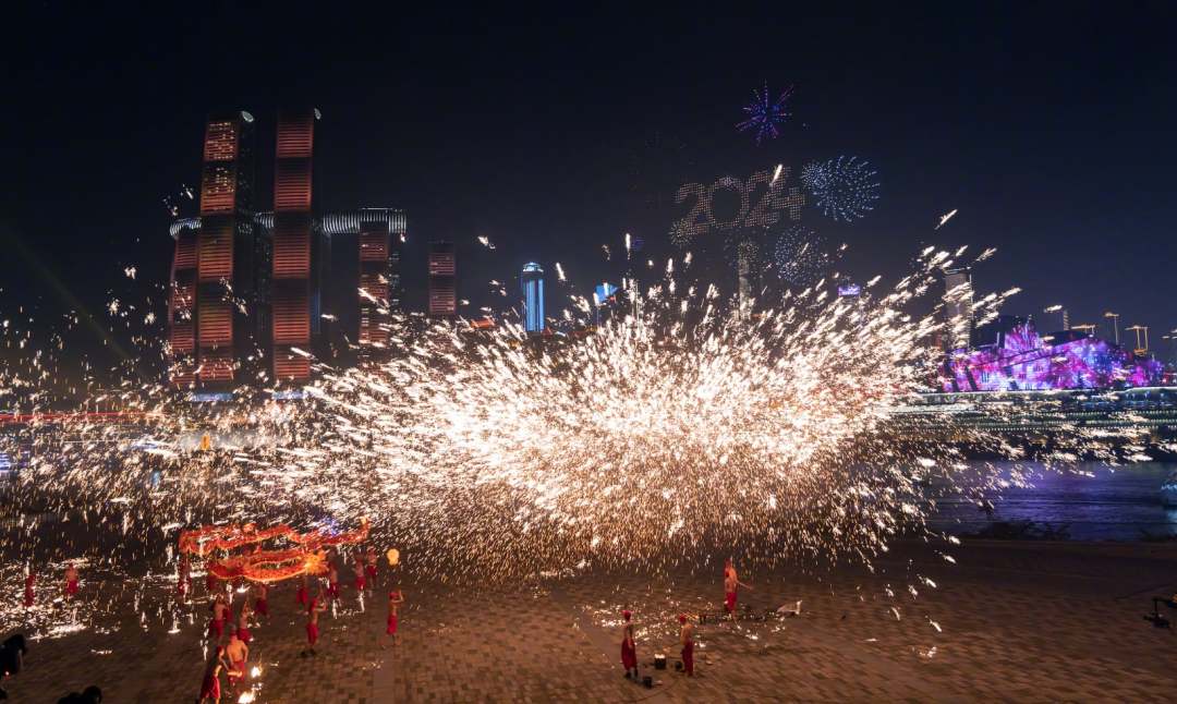 2024年2月9日,重庆,除夕夜,南滨路进行舞龙打铁花表演,流光溢彩,绚烂耀眼。