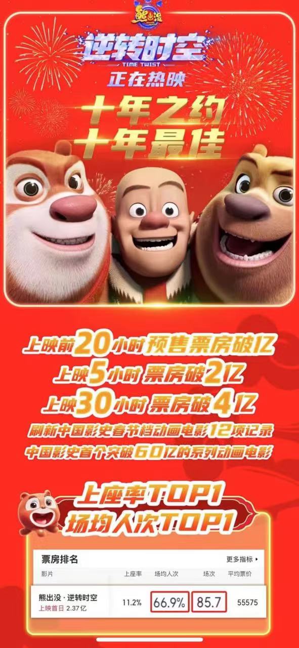 截至目前,“熊出没”系列的第十部大电影《熊出没·逆转时空》在今年春节档已经收获了超5亿元票房,大年初一在仅获得11%的排片空间下,获得单日票房第三名的成绩,日场均人次突破80人,上座率“断层式”领跑春节档,打破12项春节档动画电影的票房纪录,年初二的场次占比从首日的11.3%大幅上涨到18.1%。