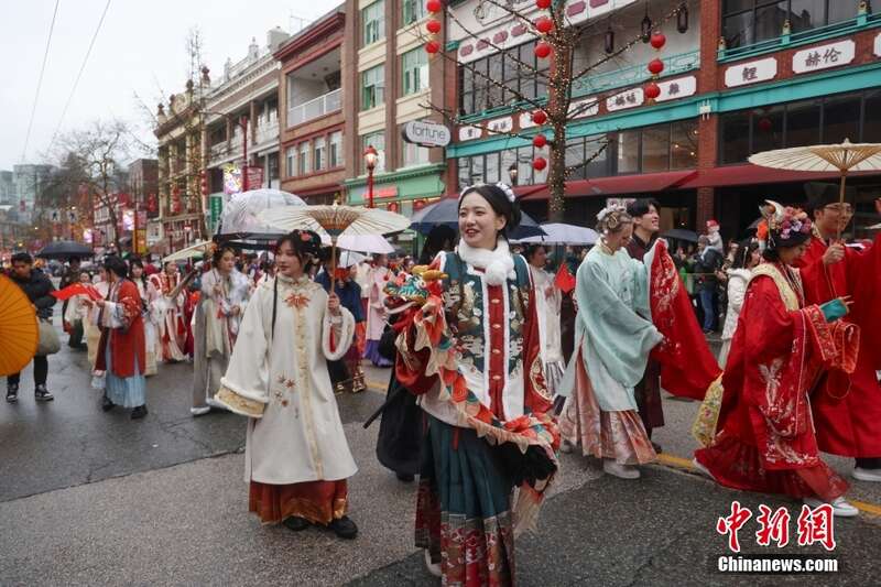 当地时间2月11日,农历甲辰龙年正月初二,作为加拿大华人社区规模最盛大的春节庆祝活动,温哥华华埠新春大游行冒雨举行。来自华人社区及其他多个族裔社区的约百个团体参加本次新春大游行,规模创下历史新高。图为华人青年身着汉服参加游行。