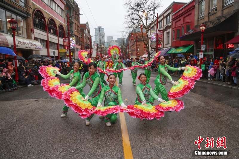 当地时间2月11日,农历甲辰龙年正月初二,作为加拿大华人社区规模最盛大的春节庆祝活动,温哥华华埠新春大游行冒雨举行。来自华人社区及其他多个族裔社区的约百个团体参加本次新春大游行,规模创下历史新高。图为当地华人文艺团体在游行中表演舞蹈。
