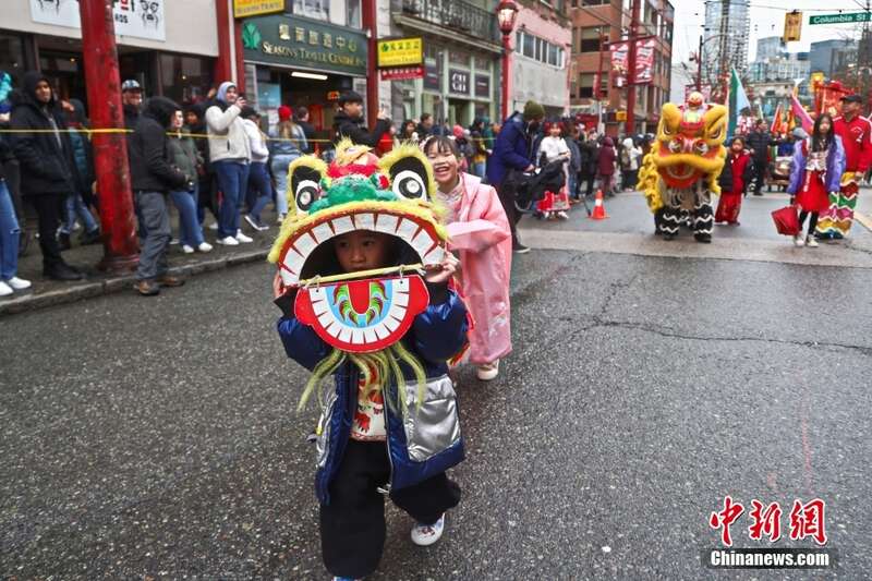 当地时间2月11日,农历甲辰龙年正月初二,作为加拿大华人社区规模最盛大的春节庆祝活动,温哥华华埠新春大游行冒雨举行。来自华人社区及其他多个族裔社区的约百个团体参加本次新春大游行,规模创下历史新高。图为“小醒狮”参加游行。