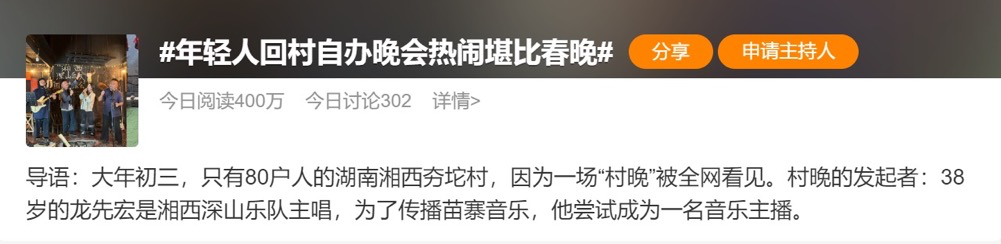 将话题#年轻人回村自办晚会热闹堪比春晚#