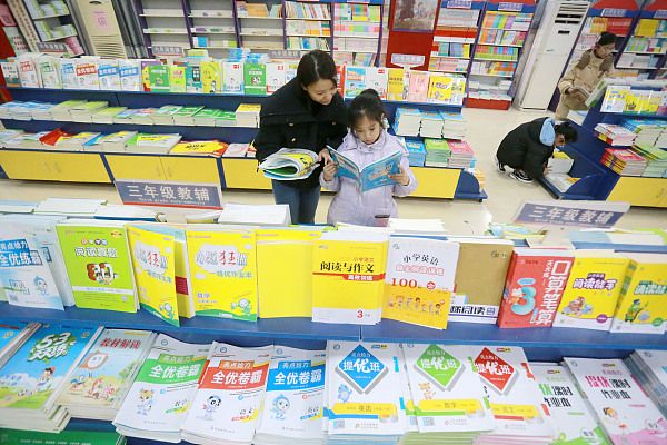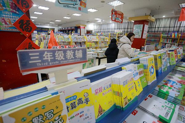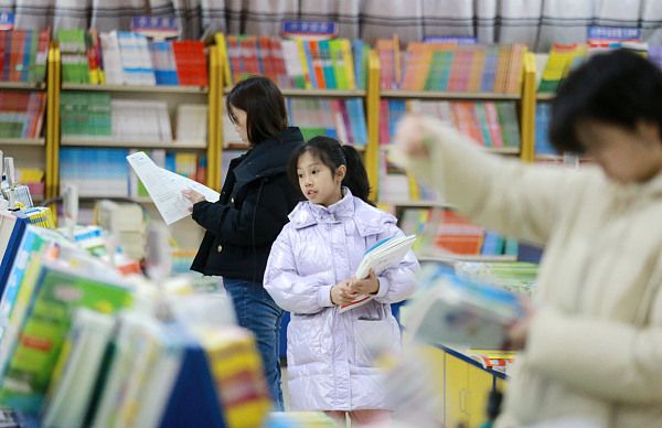 2024年2月20日,家长带孩子在江苏省扬州市一家新华书店选购图书。