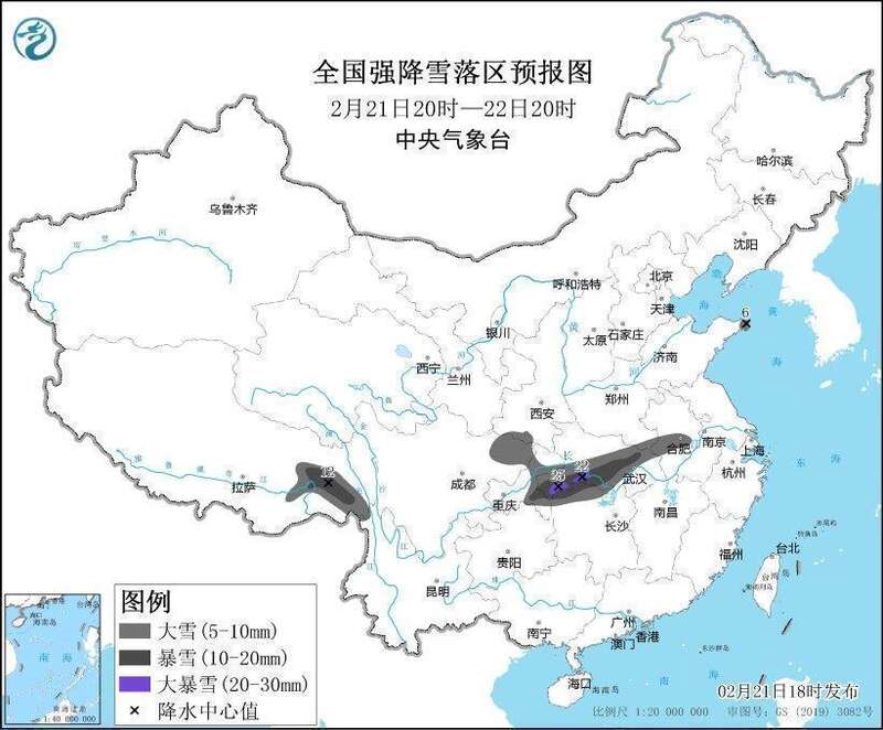 预计2月21日20时至22日20时,山东半岛东部、河南南部、安徽中部、湖北中部和西南部、湖南北部、重庆东部和北部、四川东北部、西藏东部等地有大雪,其中,湖北南部和中部、湖南北部、西藏东部等地的部分地区有暴雪或大暴雪(20~25毫米)。上述地区新增积雪深度3~8厘米,局地可达10~15厘米。