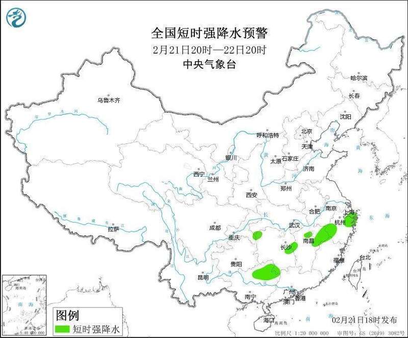预计2月21日20时至22日20时,江西西部、浙江东部、广西东北部等地的局地将有8-10级雷暴大风或冰雹天气;湖南西南部、江西中北部、浙江中北部、福建西北部、广西东北部等地的部分地区将有短时强降水天气,最大小时雨20-30毫米,局地可达40毫米以上。