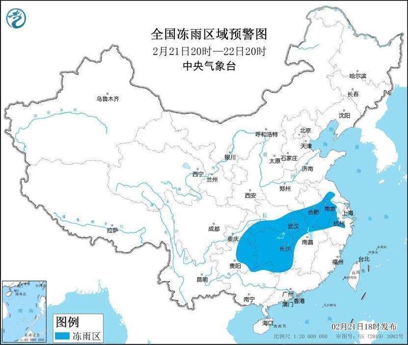 中央气象台2月21日18时继续发布冰冻黄色预警: