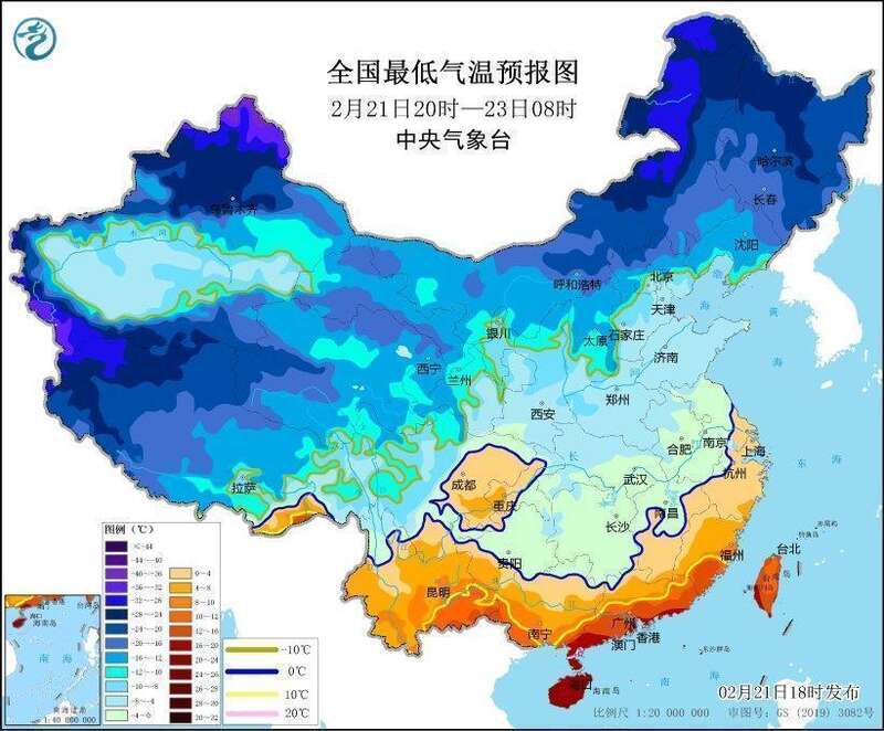 受寒潮影响,预计,2月21日20时至23日08时,我国长江以南大部地区将出现降温,日平均或最低气温普遍下降6~12℃,西南地区东南部、江南南部和中东部、华南中北部等地气温将下降12~18℃,其中,贵州东南部、广西北部等地的部分地区累计降温幅度可达20℃以上。2月23日前后,最低温度0℃线将南压到苏皖南部至湖南南部、贵州南部一带。