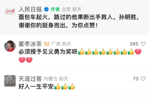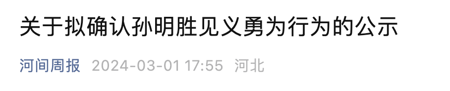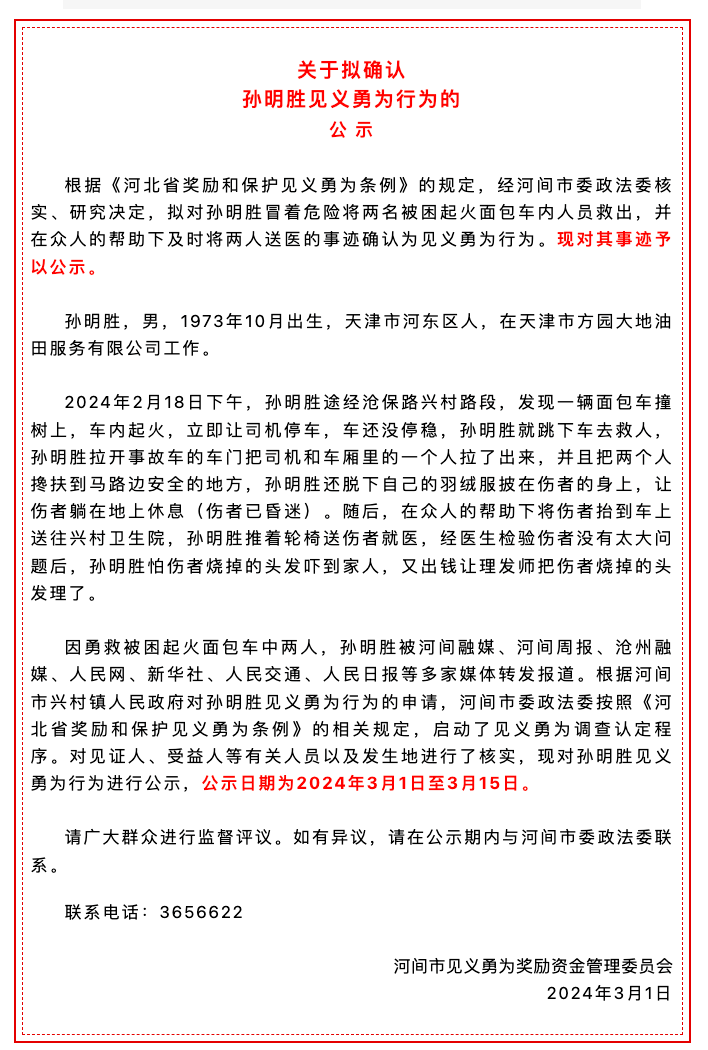 据《河间周报》报道,3月1日,事发地河北省河间市见义勇为奖励资金管理委员会发布公告,拟对孙明胜冒着危险将两名被困起火面包车内人员救出,并在众人的帮助下及时将两人送医的事迹确认为见义勇为行为,对其事迹予以公示。公示期为2024年3月1日至3月15日。