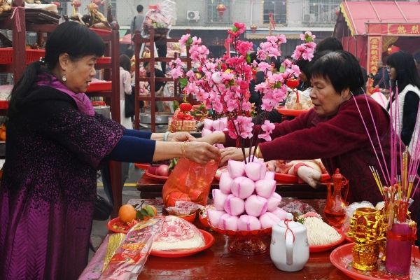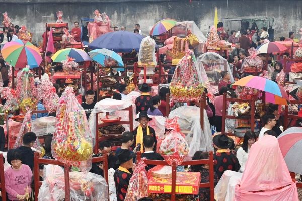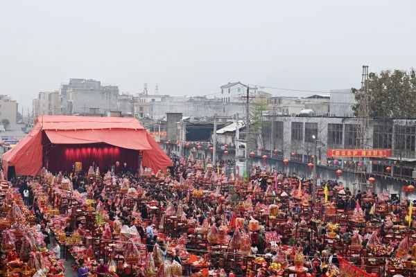 2024年3月5日,农历正月廿五,广东省揭阳市砲台镇石牌村举行“摆粿架”民俗活动,村民在粿架上摆放着甜粿、卤鹅、水果等,以祈求新年风调雨顺、五谷丰登。 中新社记者 陈楚红 摄