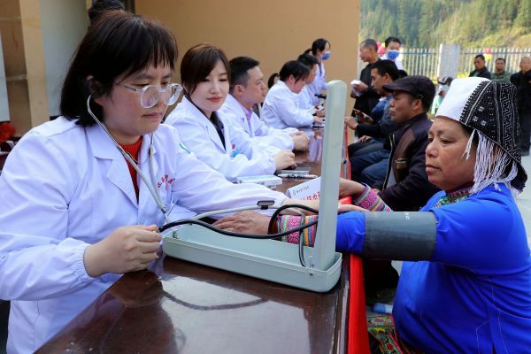 2024年3月6日,贵州榕江,三江乡冷衣村,榕江县人民医院医疗专家在为村民测量血压。