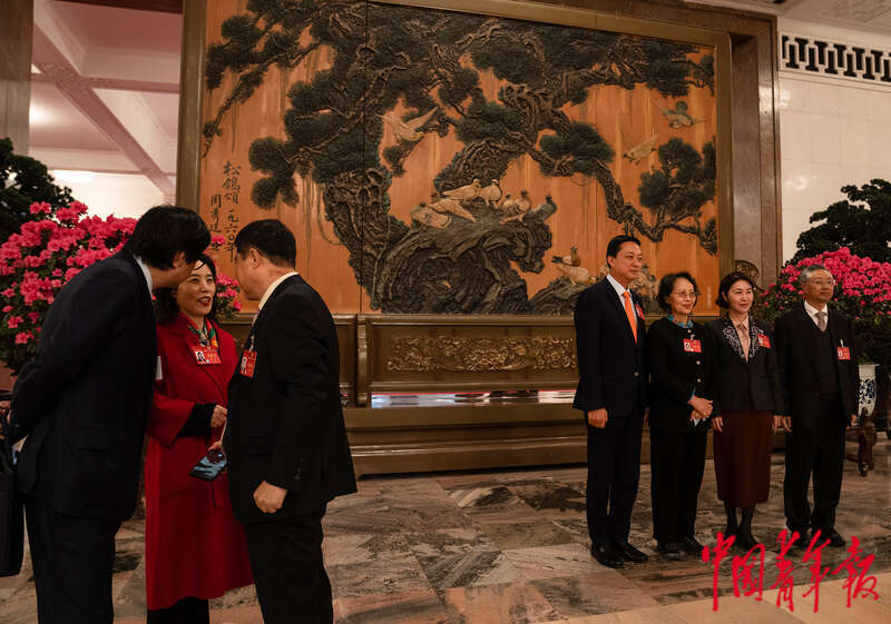3月7日,北京人民大会堂,全国政协十四届二次会议第二次全体会议结束后,参会委员互相交流。中青报·中青网记者 李峥苨/摄