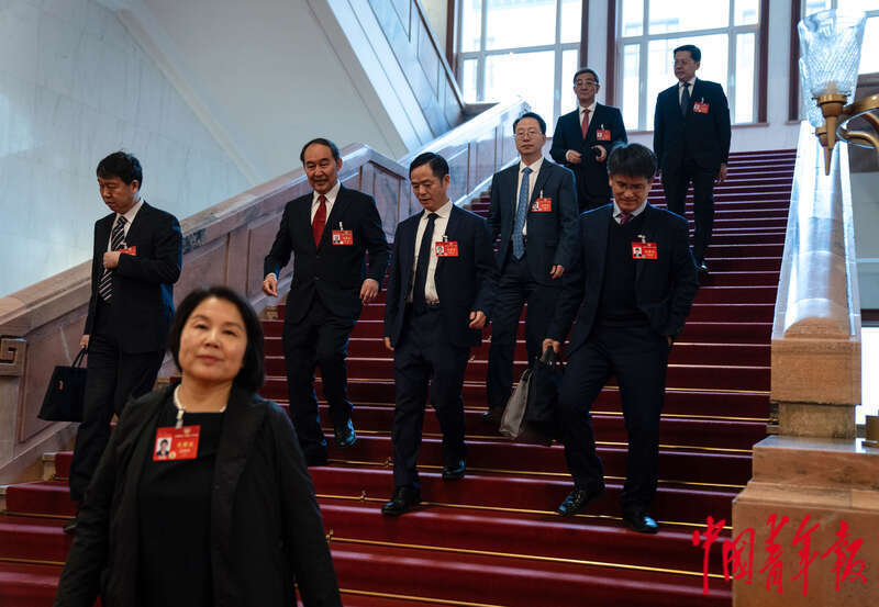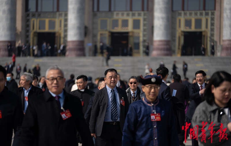 3月7日,北京人民大会堂,全国政协十四届二次会议第二次全体会议结束后,参会委员走出会场。中青报·中青网记者 李峥苨/摄