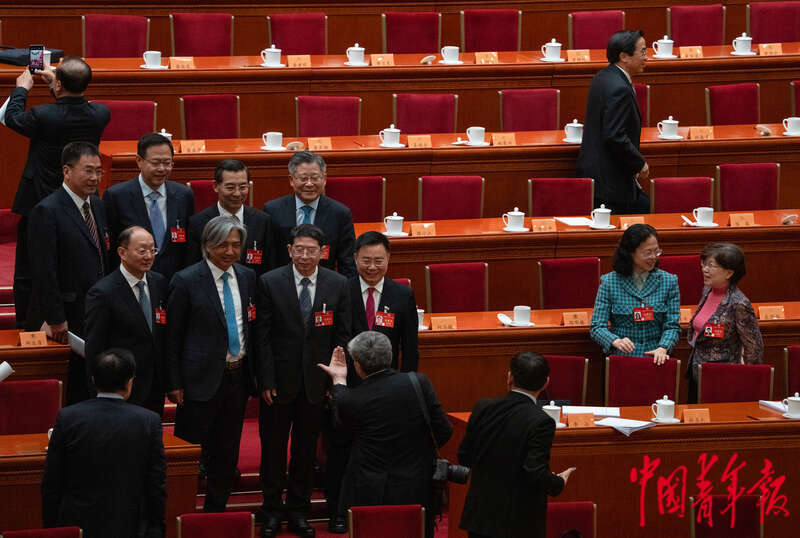 3月7日,北京人民大会堂,全国政协十四届二次会议第二次全体会议结束后,参会委员拍照留念。中青报·中青网记者 李峥苨/摄