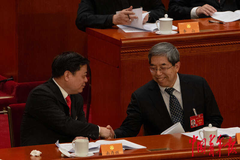 3月7日,北京人民大会堂,全国政协十四届二次会议第二次全体会议上,全国政协委员马建堂(右)结束大会发言后,浙江省工商联主席,正泰集团董事长南存辉主动与他握手致意。马建堂在大会上说,更好地满足失能老人的护理需求、减轻家人负担、提高老人生活质量已成为我国养老服务体系亟待解决的突出问题。中青报·中青网记者 李峥苨/摄
