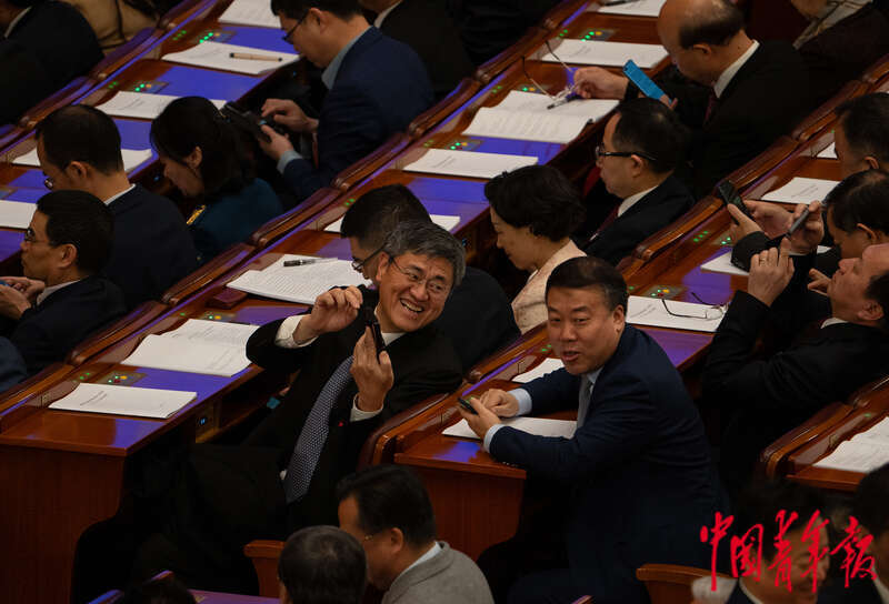 3月7日,北京人民大会堂,全国政协十四届二次会议第二次全体会议开始前,参会委员纷纷拍照留念。中青报·中青网记者 李峥苨/摄