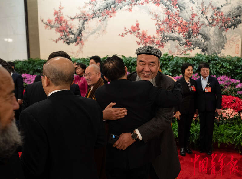 3月7日,北京人民大会堂,全国政协十四届二次会议第二次全体会议开始前,两位参会委员拥抱问候。中青报·中青网记者 李峥苨/摄