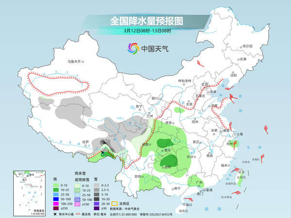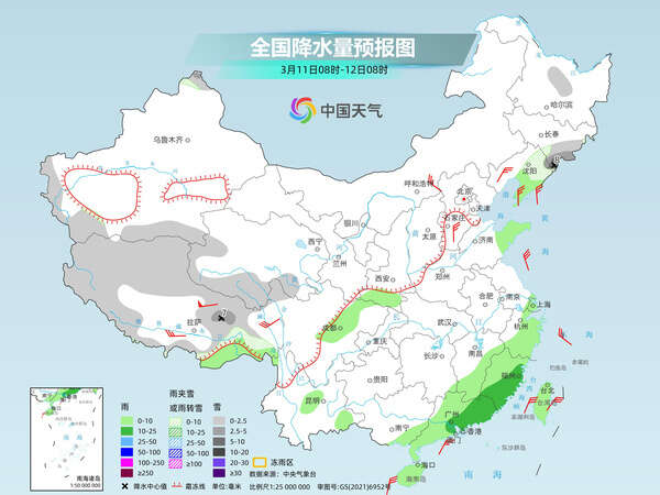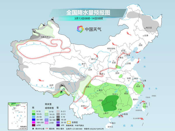后天,南方大范围阴雨将再度铺展,新疆北疆北部和沿天山地区、西藏西北部和东部、内蒙古东北部、黑龙中东部、青海南部、川西高原等地部分地区有小到中雪或雨夹雪,其中,新疆北疆北部和西部高海拔地区、西藏东部等地局部地区有大雪(5~9毫米)。西藏东南部、西南地区东部、江汉大部、江南大部、华南大部等地部分地区有小到中雨,其中,西藏东南部等地局部地区有大雨。