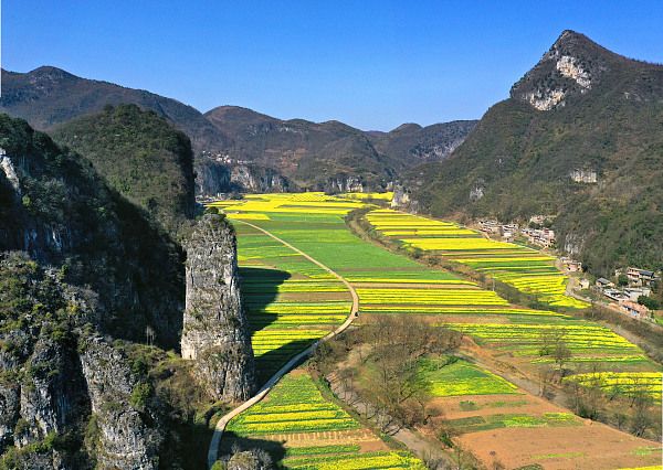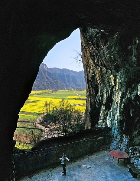 2024年3月11日,贵州省毕节市,织金县龙场镇阳光村营上古寨里的洞中人家,远眺“象背上的营上古寨”。