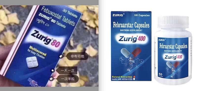 刘彬今年年初再次购买时,发现多个购物平台都不再出售zurig80非布司他降酸片,询问客服后被告知缺货。然后他就看到一个“zurig400”的产品,和zurig80包装几乎一模一样,产品宣传也是说降尿酸、痛风药。