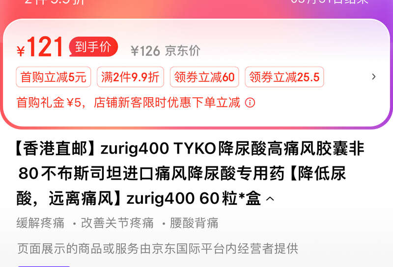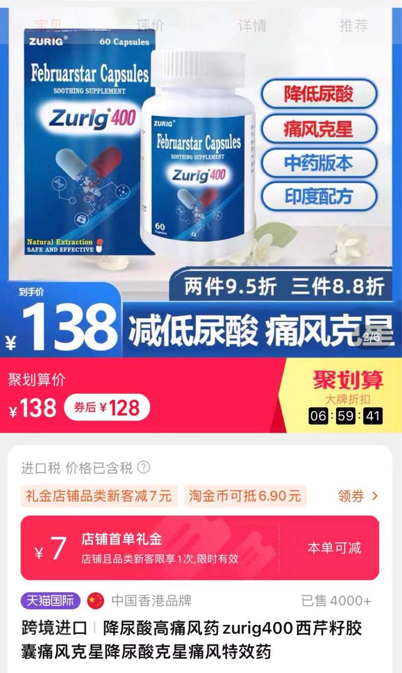 此外,zurig400在销售页面还模仿印度zurig80,宣称降尿酸、痛风药。澎湃新闻记者调查发现,zurig400目前在多个网购平台有售,有商家显示已出售4000+。 经了解后得知,印度zurig80实际上是一款仿制药,目前国内并未获批上市;而zurig400却是一款香港产的保健品类目产品,并非药品。但产品宣传时却使用“痛风特效药”“印度配方”“中药非布”等词语,让患者产生误会。