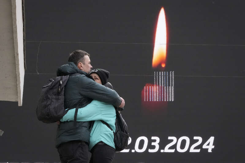 “克罗库斯城”音乐厅废墟附近的临时悼念处弥漫着悲伤与愤怒,悼念者络绎不绝,鲜花堆积如山。除了玫瑰和康乃馨,人们还留下玩具,缅怀那些在屠杀中死去的儿童。